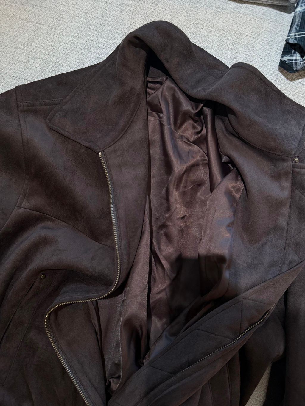 人造麂皮外套建議乾洗,日常清潔以專用麂皮刷輕刷去除灰塵,並利用麂皮橡皮擦或爽身粉(小蘇打粉)處理局部污漬與油漬,最後以陰涼通風處自然晾乾,必要時可噴上防水噴霧加強保護。